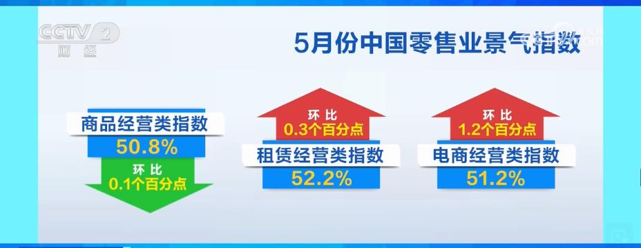 从行业分类看,5月份商品经营类指数为50.8%,较上月微降0.1个百分点;租赁经营类指数为52.2%,较上月微升0.3个百分点;电商经营类指数为51.2%,较上月小幅上升1.2个百分点。