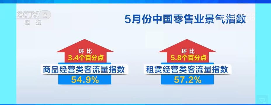 值得注意的是,5月份商品经营类客流量指数为54.9%,较上月上升3.4个百分点;租赁经营类客流量指数为57.2%,较上月大幅上升5.8个百分点。