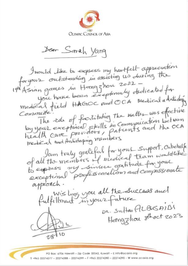 8日杭州亚运会顺利闭幕,当天95后姑娘杨悦收到了来自亚奥理事会医疗委员会和反兴奋剂委员会主席Dr. Sultan AL Busaidi(苏丹·阿尔·布赛迪博士)的一封亲笔感谢信。