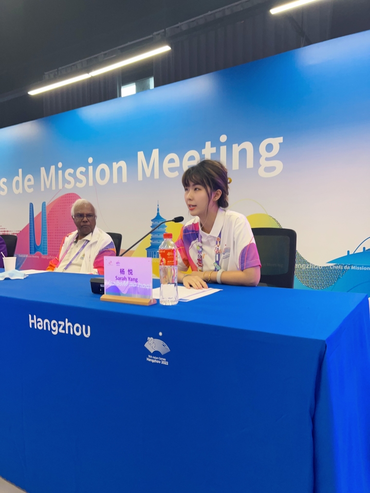 在10月7日最后一场首席医疗官会议上,杨悦还作为医疗卫生部陈述人,向各国家(地区)代表团介绍亚运会整体医疗保障情况和总结医疗救治信息。