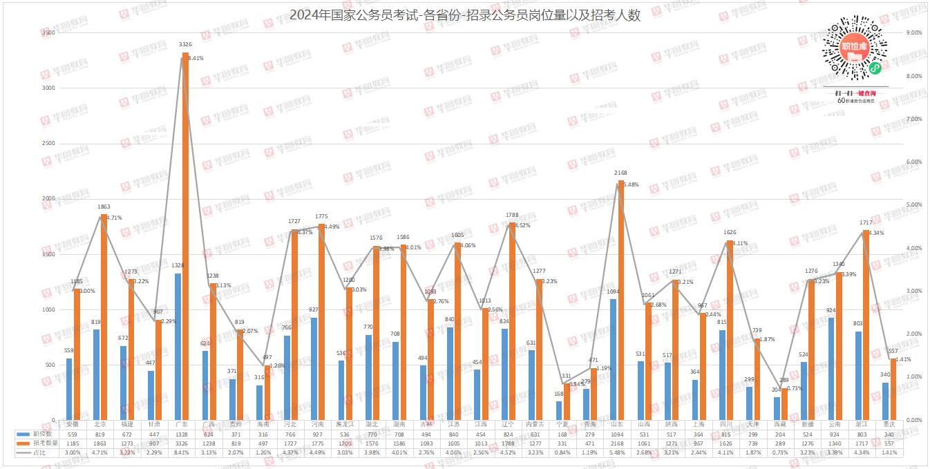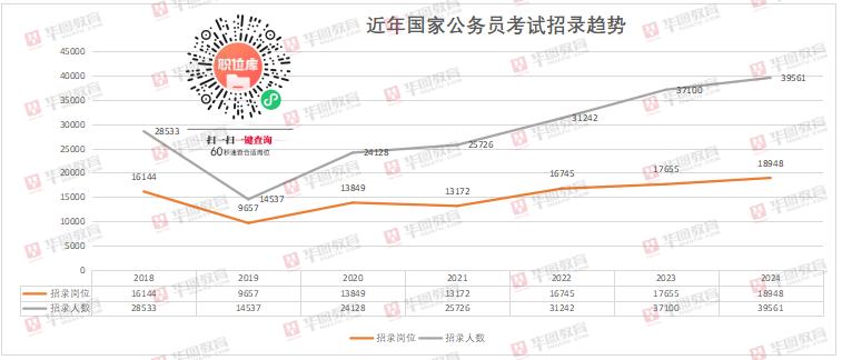 职位表也已经发布。华图教育首席研究员刘有珍分析说,2024年国考共计设置了18948个岗位,计划招录39600人,相比2023年计划招录人数增加6.7%,国考再度迎来了一小波扩招。