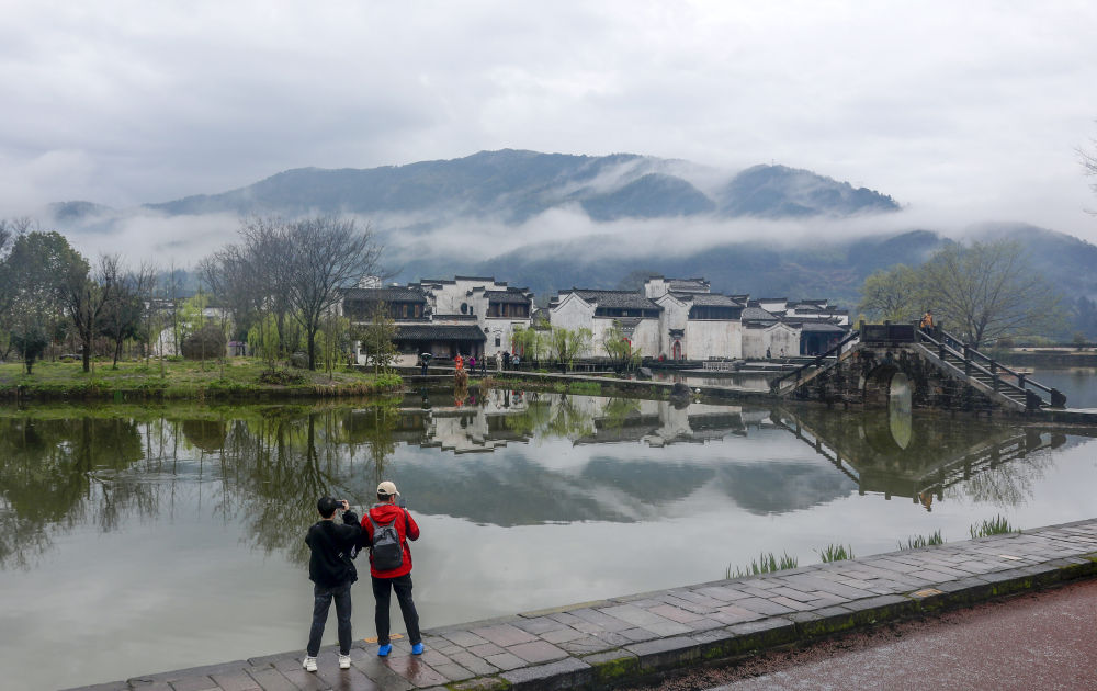 3月22日,游客在安徽省黄山市徽州区呈坎古村欣赏雨后春景。新华社发(施亚磊 摄)