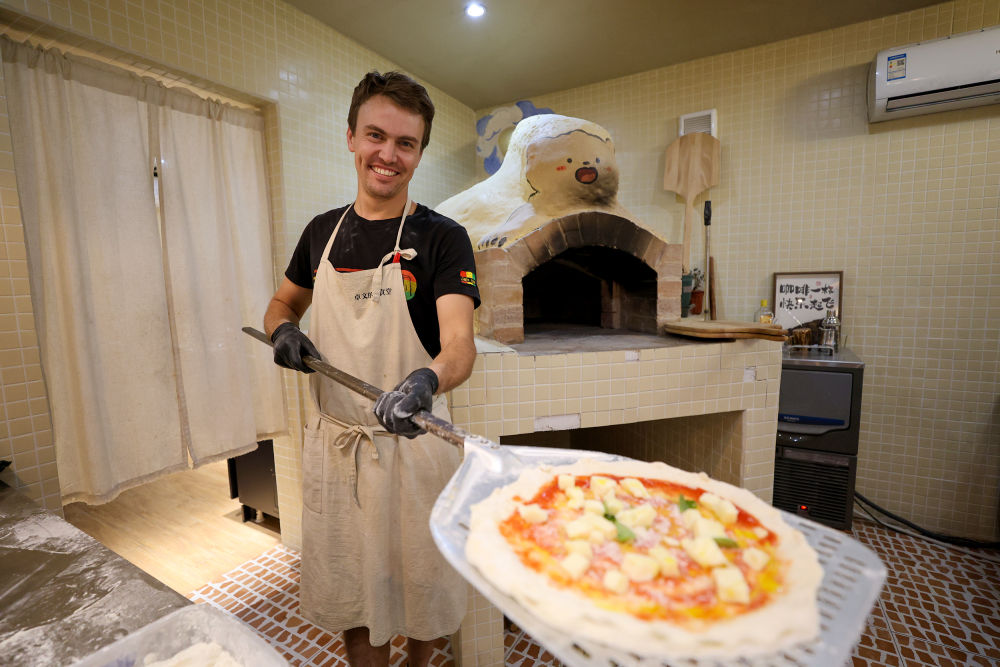 9月12日,在安徽省黄山市屯溪区南溪南村“卓文的小食堂”,美国人卓文展示制作的披萨。新华社发(樊成柱 摄)