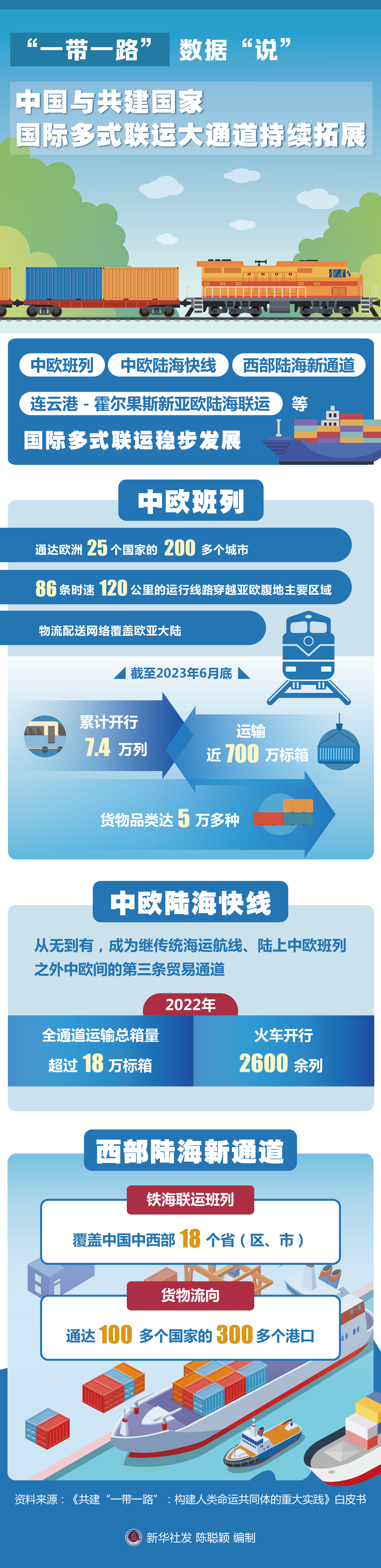 国际多式联运大通道持续拓展。中欧班列、中欧陆海快线、西部陆海新通道、连云港-霍尔果斯新亚欧陆海联运等国际多式联运稳步发展。中欧班列通达欧洲25个国家的200多个城市,86条时速120公里的运行线路穿越亚欧腹地主要区域,物流配送网络覆盖欧亚大陆;截至2023年6月底,中欧班列累计开行7.4万列,运输近700万标箱,货物品类达5万多种,涉及汽车整车、机械设备、电子产品等53大门类,合计货值超3000亿美元。中欧陆海快线从无到有,成为继传统海运航线、陆上中欧班列之外中欧间的第三条贸易通道,2022年全通道运输总箱量超过18万标箱,火车开行2600余列。西部陆海新通道铁海联运班列覆盖中国中西部18个省(区、市),货物流向通达100多个国家的300多个港口。