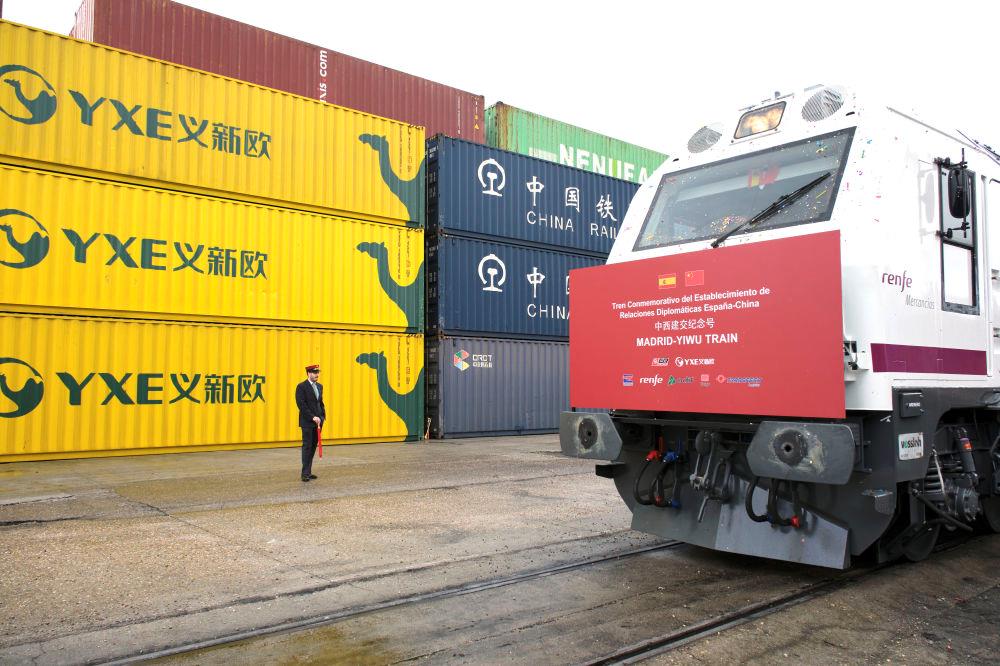 △2023年3月9日,以“中西建交纪念号”特别命名的“义新欧”中欧班列从马德里鸣笛发车,与从义乌同时开出的列车双向而行。