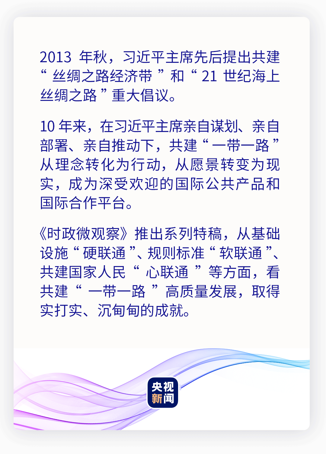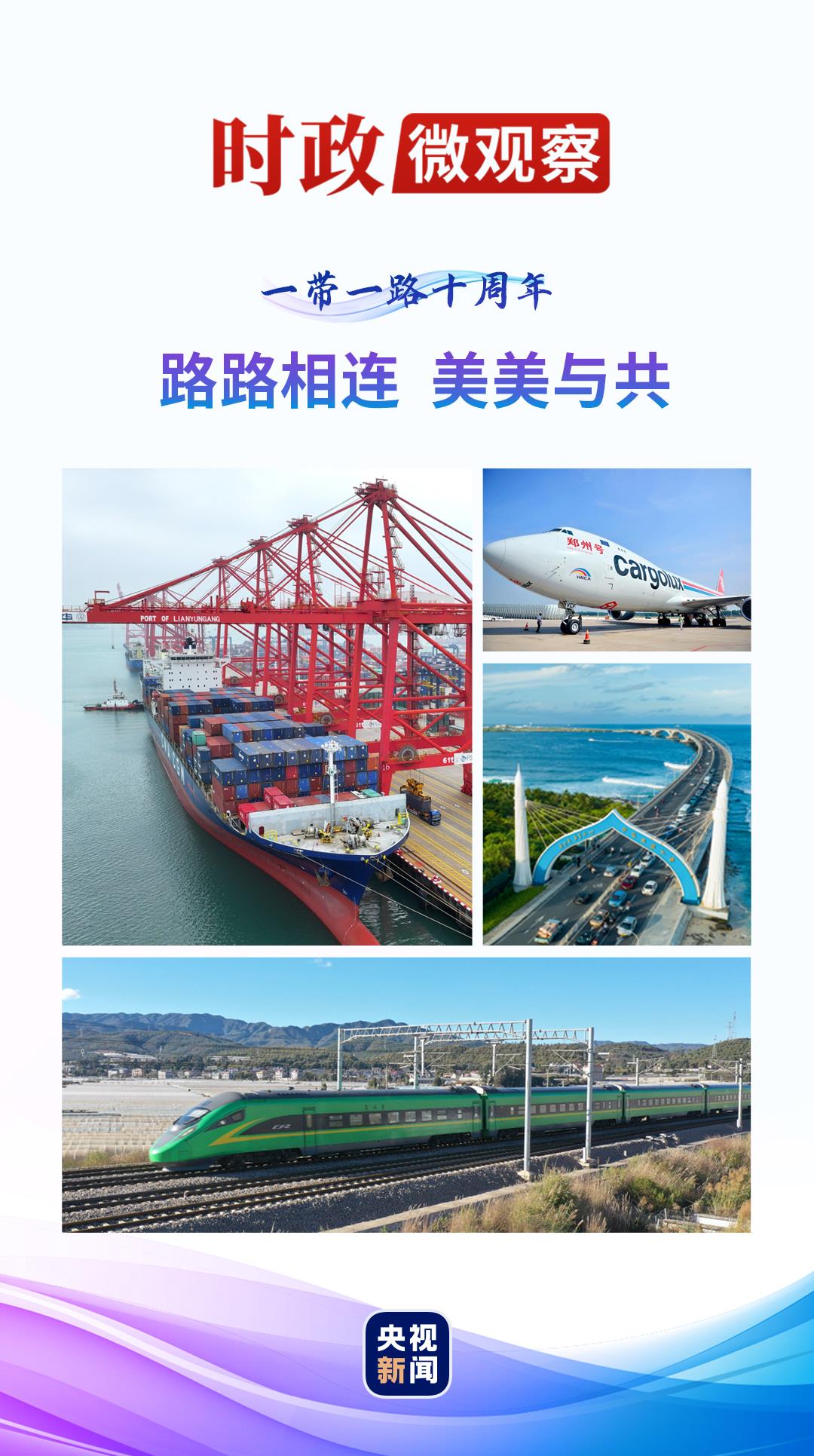 10年来,中国与共建国家以基础设施“硬联通”为重要方向,携手前行。在“钢铁驼队”的汽笛声里、在跨海大桥上的车流中、在“空中丝绸之路”的万米高空、在“数字丝绸之路”的“云端”……一条条幸福路、繁荣路,铺就一幅共建“一带一路”的壮阔画卷。