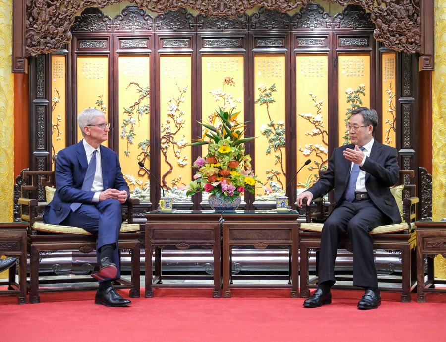 Chinese Vice Premier Ding Xuexiang, also a member of the Standing Committee of the Political Bureau of the Communist Party of China Central Committee, meets with Apple CEO Tim Cook in Beijing, capital of China, Oct. 19, 2023. (Xinhua/Ding Lin)