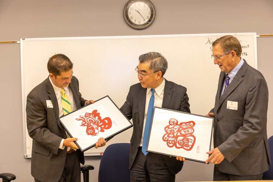 Chinese Consul General in New York Huang Ping (C) presents gifts to Michael Grigalonis (L), Chester County Economic Development Council (CCEDC) president and chief operating officer, and F. William Bogle, chairman of the Pennsylvania Global Business Advisors, at a meeting at the CCEDC in Exton, Pennsylvania, the United States, Oct. 20, 2023. (Photo by Winston Zhou/Xinhua)