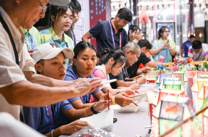 9月25日,在杭州亚运会淳安赛区,泰国运动员(两位紫色衣服者)在观看淳安县里商仁灯的制作过程。图源 新华社