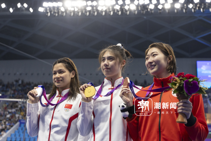 张雨霏(中)与池江璃花子(右)。潮新闻记者 李震宇 倪雁强 摄