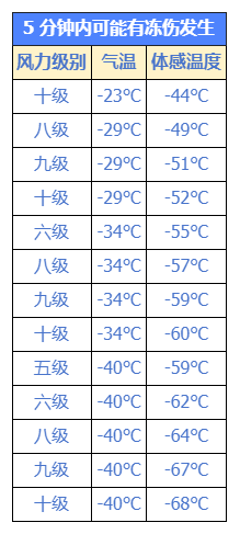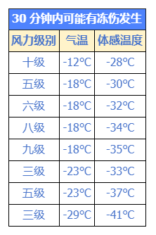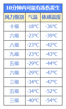 风力级别越高,身体热量流失速度越快,皮肤温度越低。风力级别很高时,即使气温不是特别低,冻伤等严重的天气相关健康问题也更可能发生。不同风力级别和气温时的体感温度和可能发生冻伤的时间见上表。