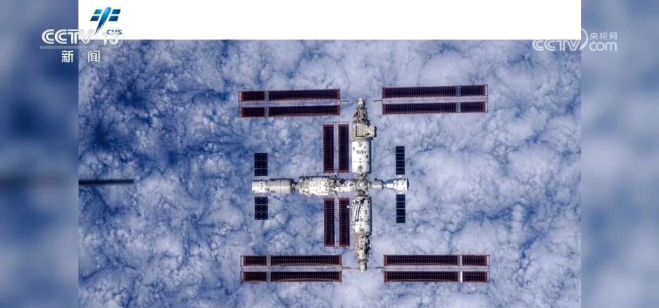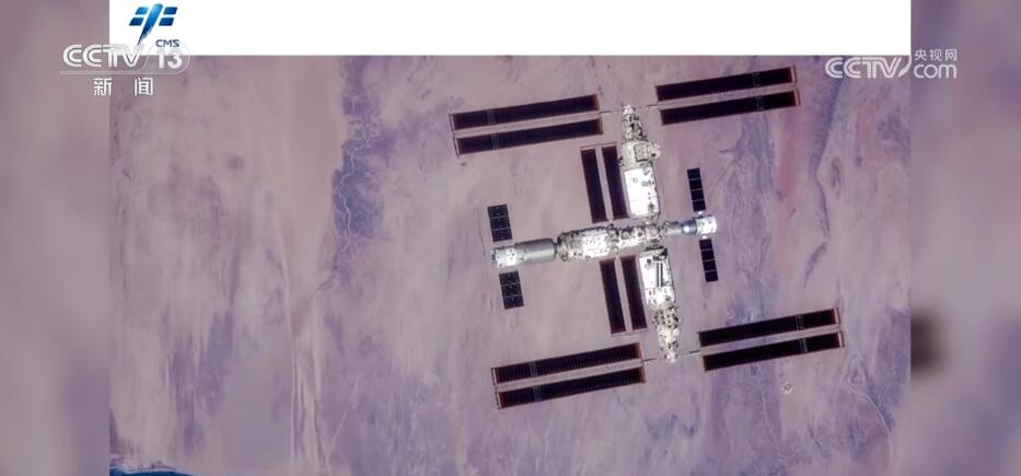 在绕飞至空间站正上方600米点位后,神舟十六号航天员乘组利用手持高清相机,进行了以地球为背景的空间站组合体全景图像拍摄。