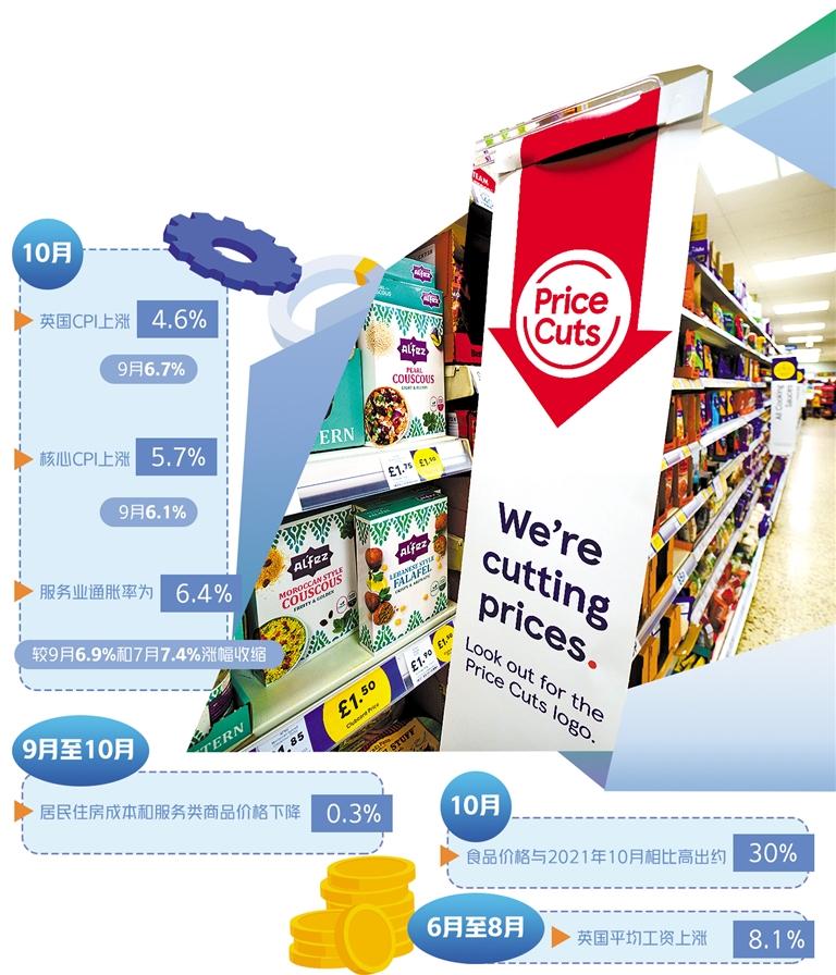 英国国家统计局表示,近期通胀缓解最大的贡献来自于住房和服务、食品的价格下降。受能源价格下降带动,9月至10月居民住房成本和服务类商品价格下降了0.3%。同时,食品价格涨幅放缓,但仍处于近年来较高水平,今年10月食品价格与2021年10月相比高出约30%。