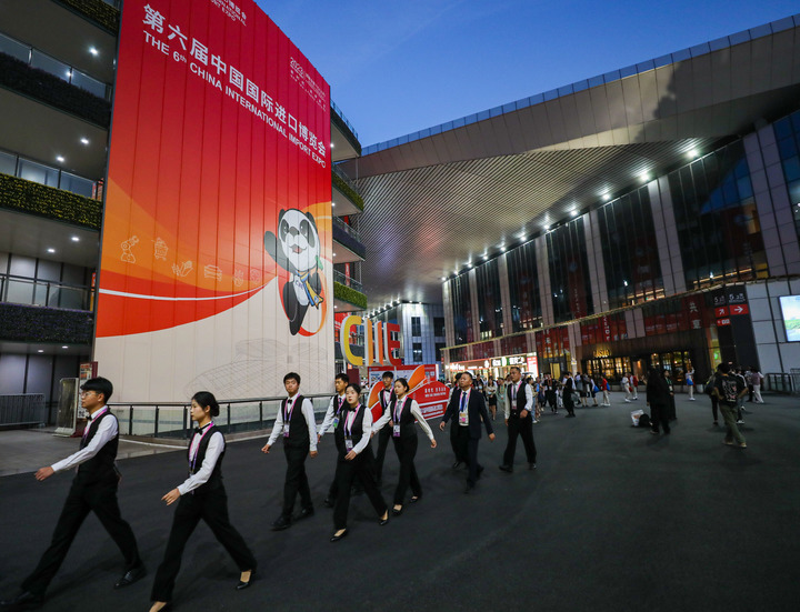 11月5日,工作人员在国家会展中心(上海)经过第六届进博会巨幅海报。新华社记者 辛梦晨 摄