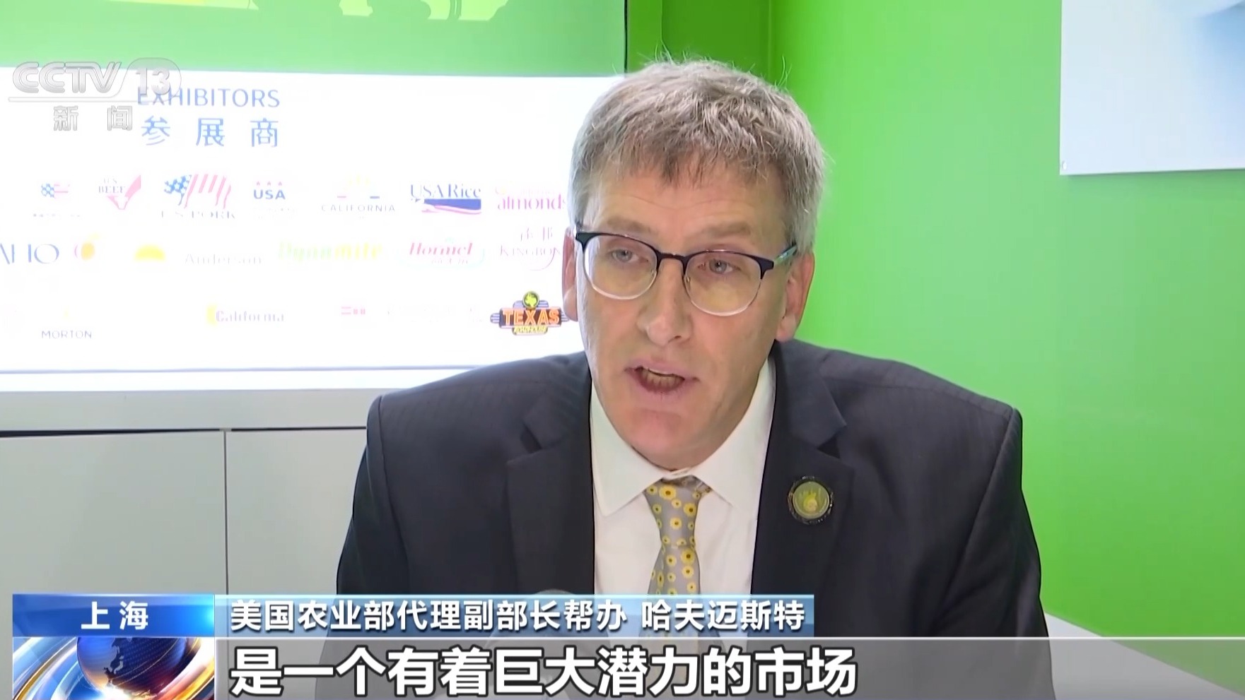本届进博会,美国首次开设国家级展馆。同样是首次亲身感受进博会的美国农业部代理副部长帮办在开馆仪式结束后,接受了总台央视记者的采访。他表示,中国市场潜力巨大,推动两国农业合作是“双赢”。