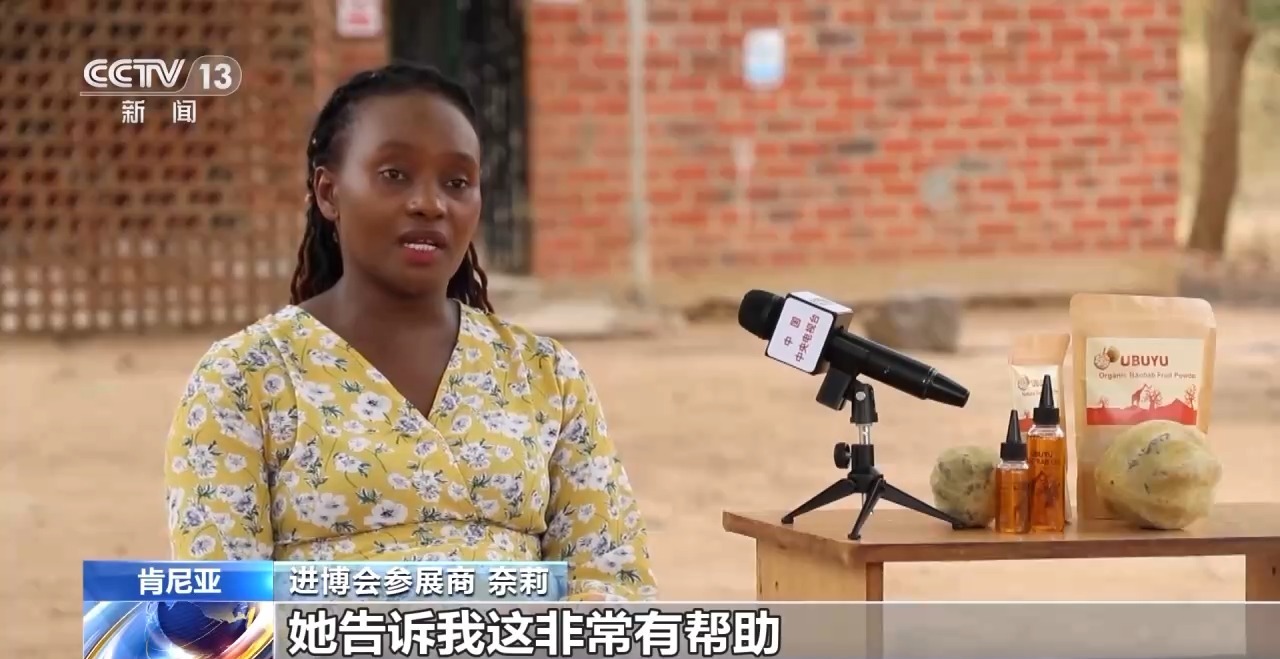 总台记者 王靖雯:在肯尼亚猴面包树展商的展位,奈莉的弟弟从肯尼亚带来了猴面包树果粉和猴面包树油这两款产品。这两款独特的产品吸引了不少观展的客户前来了解。