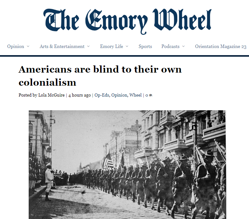 中国日报网11月3日电(党超峰)当地时间2日,美国埃默里大学学生Lola McGuire在该校学生学报《埃默里车轮》(The Emory wheel)网站上发表文章批评美国的殖民主义。