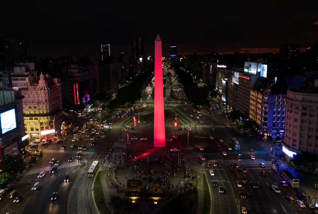 1月22日,阿根廷首都布宜诺斯艾利斯市中心的地标性建筑方尖碑点亮“中国红”,庆祝中国春节(无人机照片)。新华社发(马丁·萨巴拉 摄)