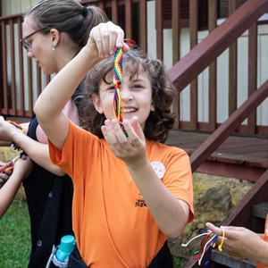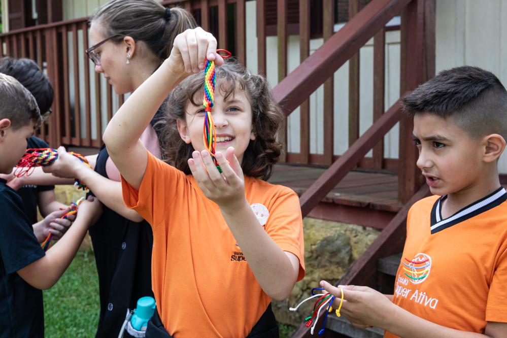 10月30日,在巴西巴拉那州哥伦布市政博物馆外,学生展示来自中国山东省菏泽市的特色物品。新华社记者 王天聪 摄