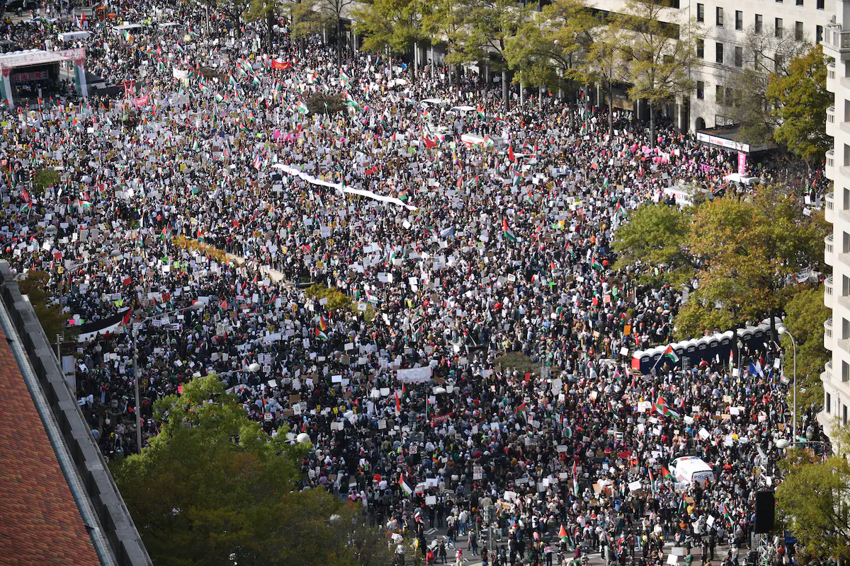 《华盛顿邮报》称,全美多地抗议者当天聚集华盛顿,他们涌入距离白宫一个街区的自由广场。在集会舞台上,演讲者带领人群高呼“解放,解放巴勒斯坦!”“现在停火!”许多人猛烈抨击拜登对以色列的支持。《以色列时报》补充说,发言者呼吁加沙立即停火,并指责以色列在加沙进行“种族灭绝”。