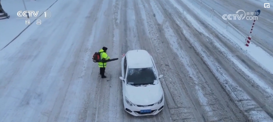 交警身背吹风设备 路口吹去车上积雪