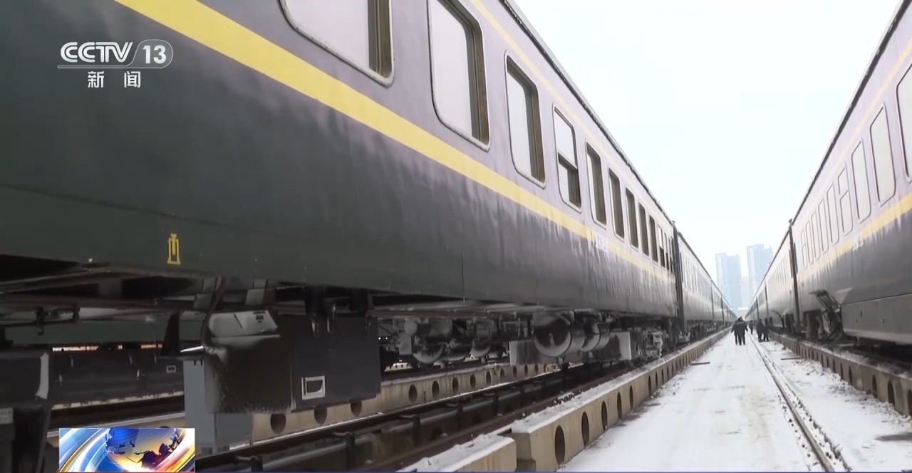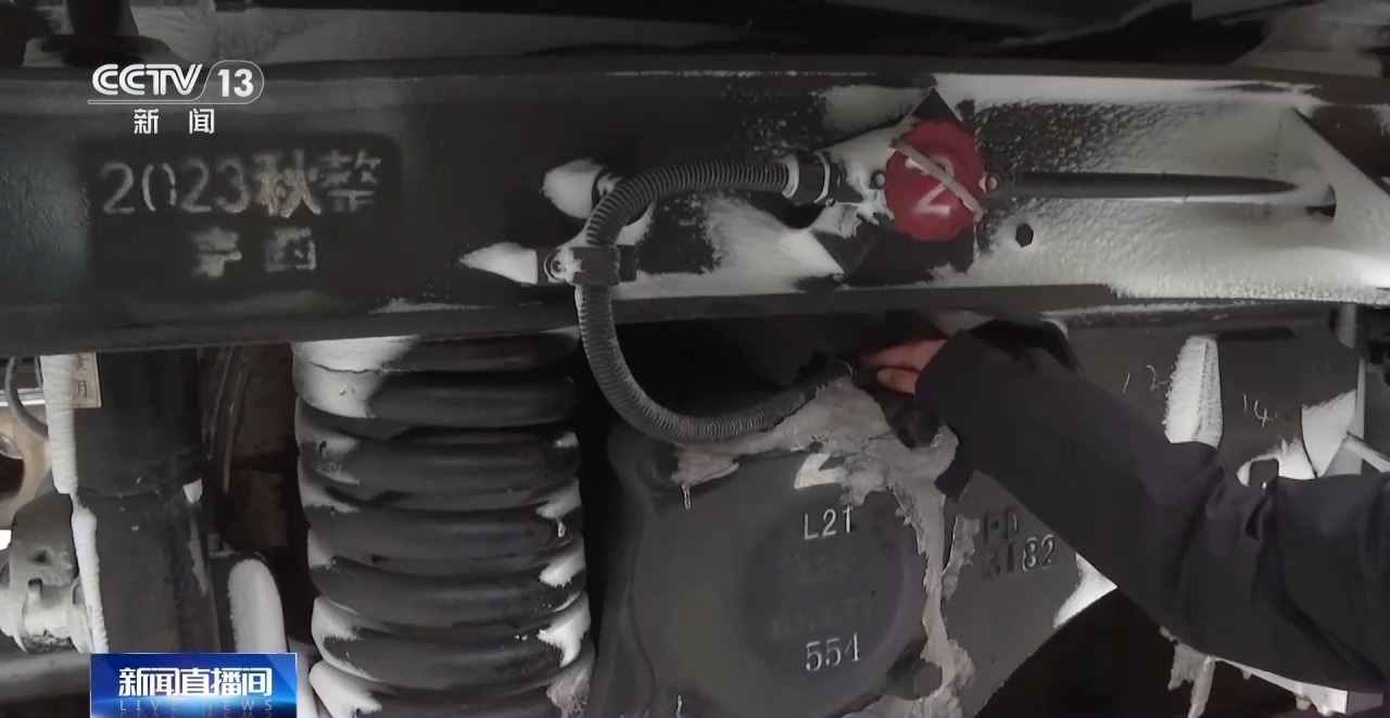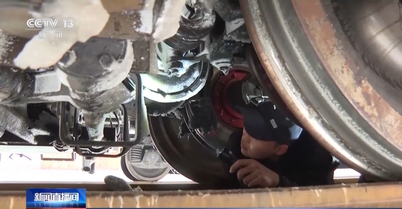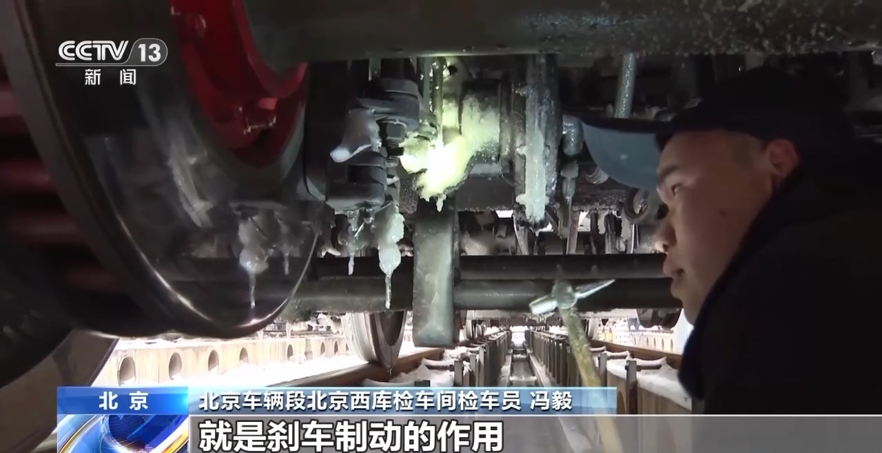 总台记者 魏雨彤:每辆列车在每个车厢都有一个车轴温度传感器,它可以实时监测到列车车轴的温度,通过监测,地面监控中心就能实时监测到列车运行过程中,轴的温度,以保障列车运行安全。在凿(冰)的过程中可以明显感觉到这个冰其实是很厚的,需要一些力气才能把冰给除掉。
