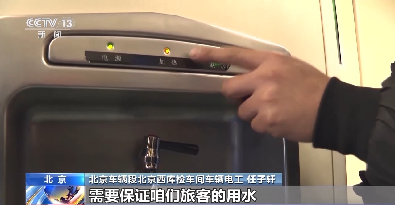 北京车辆段北京西库检车间车辆电工 任子轩:车厢里边的暖气片,外边的罩、螺丝不能松动,外壳不能松动,里边暖气片要够温度。客车的开水炉,需要保证旅客的用水。经过我们这个列车在库里大概一个多小时的预热,客室里边的温度已经达到了出库的标准。
