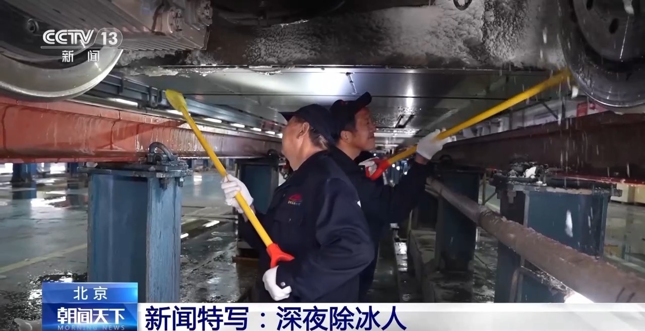 北京动车段北京南动车运用所一级修车间值班主任 王昌雷:线上对动车组的运行状态有一个TEDS检测系统,如果有冰覆盖,是看不见动车具体的机械部件,所以入库以后,一定要先把冰除掉。