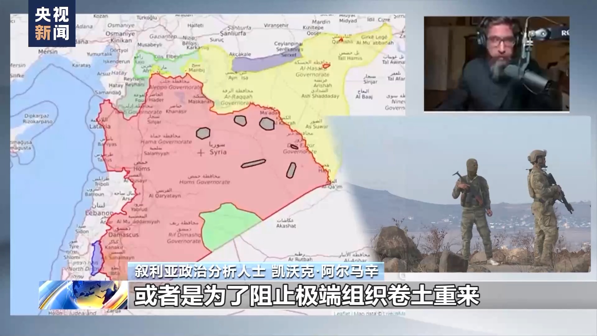 叙利亚政治分析人士 凯沃克·阿尔马辛:现在美国说他们在叙利亚是为打击极端组织或者是为了阻止极端组织卷土重来,但是如果你看看地图,这片黑色的区域是极端组织活动区域,这些区域都位于幼发拉底河西岸,这里是由叙利亚政府军驻守的。在美国非法驻军控制的地方(黄色区域)是没有极端组织活动区域的,所有极端组织活动区域都是靠近叙利亚政府军控制区。这片绿色区域同样被美军占领,这是坦夫地区,有很多相关报道指出,极端组织的部分残余势力就在这片被美军占领的区域或者是外围地带活动,他们(美军)允许他们(极端组织)在这活动,并对叙利亚政府军控制区发动袭击,而如果叙利亚政府军尝试接近这片区域,他们就会遭到美国非法驻军的打击。