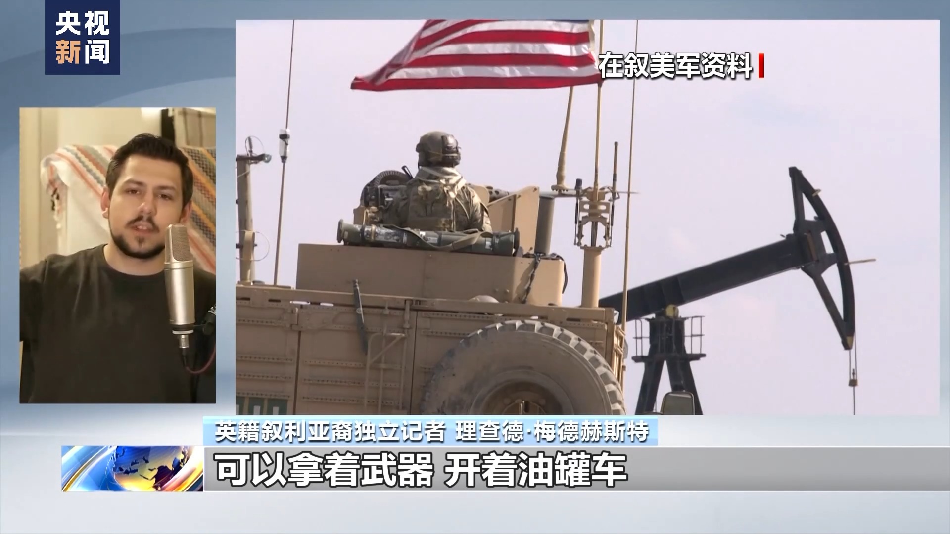 英籍叙利亚裔独立记者 理查德·梅德赫斯特:为什么对某些国家而言,可以拿着武器,开着油罐车,还有坦克,在叙利亚为所欲为。叙利亚油田不需要你来保护,如果英国和美国当年没有入侵伊拉克,极端组织也就不会出现,这一切都是相互关联的。(美西方)策动(中东地区国家)政权更迭,留下政治真空,你觉得接下来会发生什么?