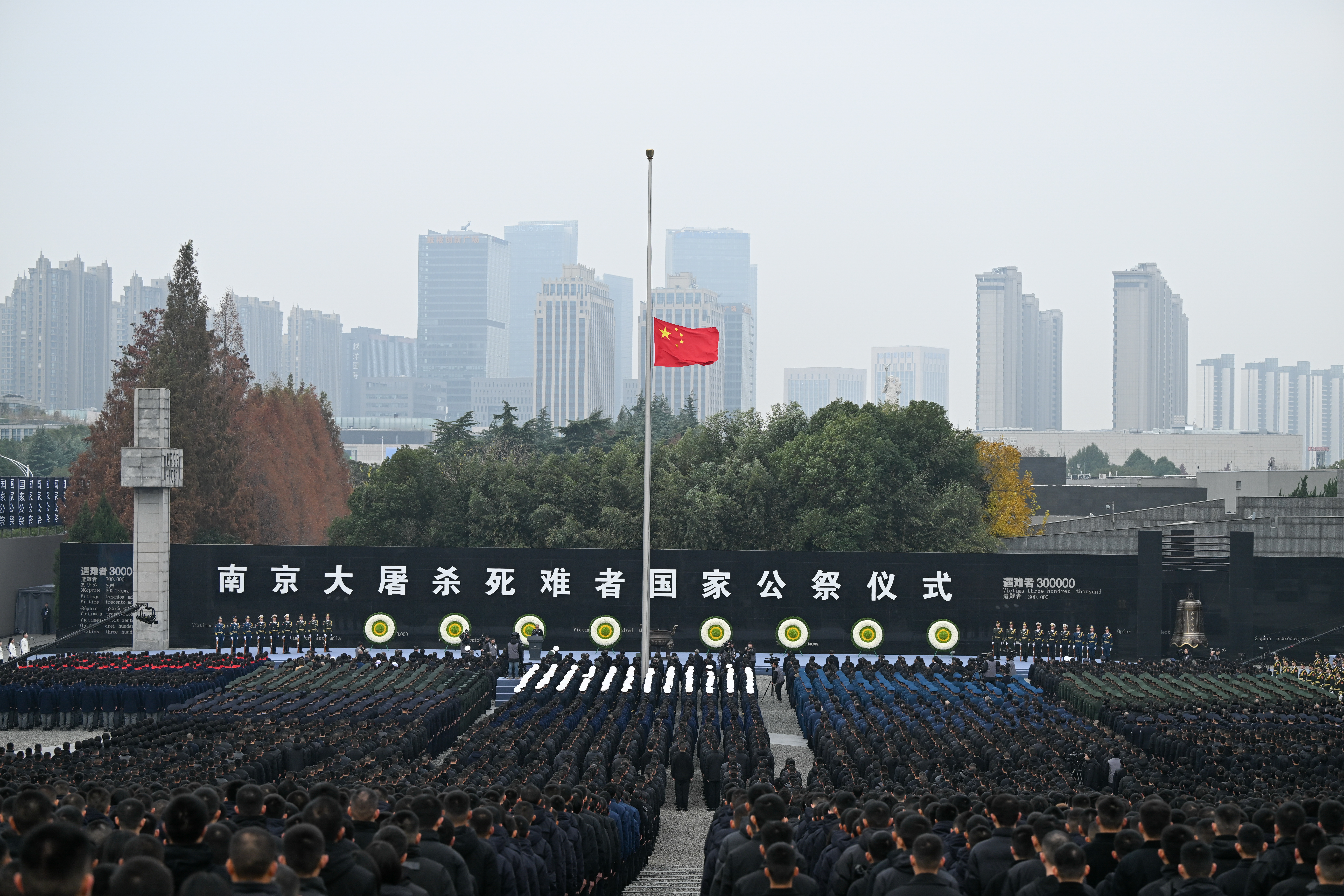 10时整,南京大屠杀死难者国家公祭仪式在侵华日军南京大屠杀遇难同胞纪念馆的公祭广场上隆重举行。国旗半降,哀乐低回,以国之名,公祭殇难。