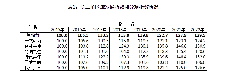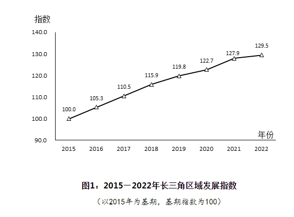 从测算结果看,以2015年为基期,2022年长三角区域发展指数为129.5,比上年提高1.6,年均提高4.2。