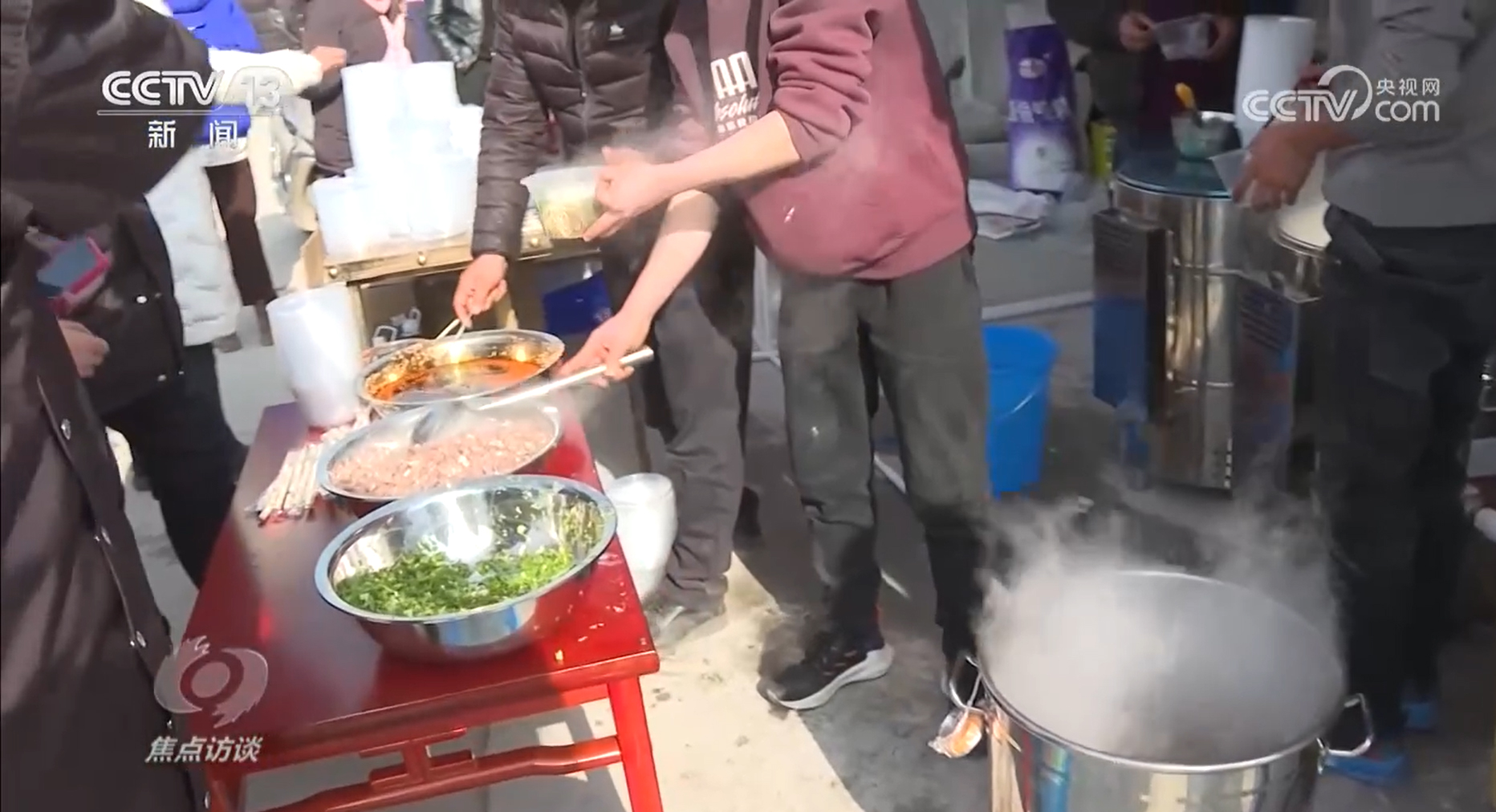 由于民房受损严重,无法继续居住,安置受灾群众就成了当务之急,来自各地的物资源源不断运抵受灾地区。到了中午,受灾群众的午餐怎么解决?当地在安置点设置了一个牛肉面摊,为受灾群众免费提供牛肉面,让受灾群众吃到了热乎乎的震后第一餐。
