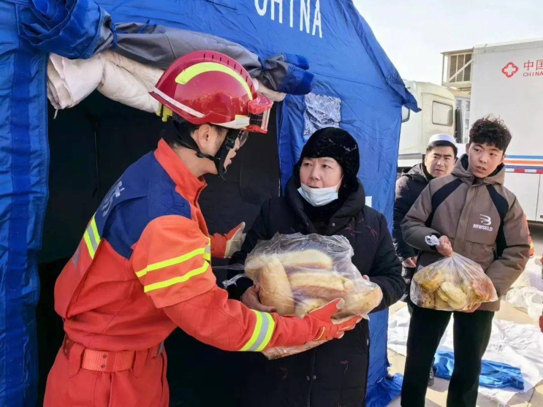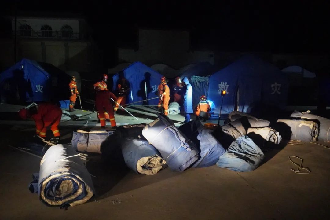 12月19日,在甘肃省临夏回族自治州积石山保安族东乡族撒拉族自治县大河家镇陈家村,救援力量在现场整理物资开展救援。新华社记者 马希平 摄