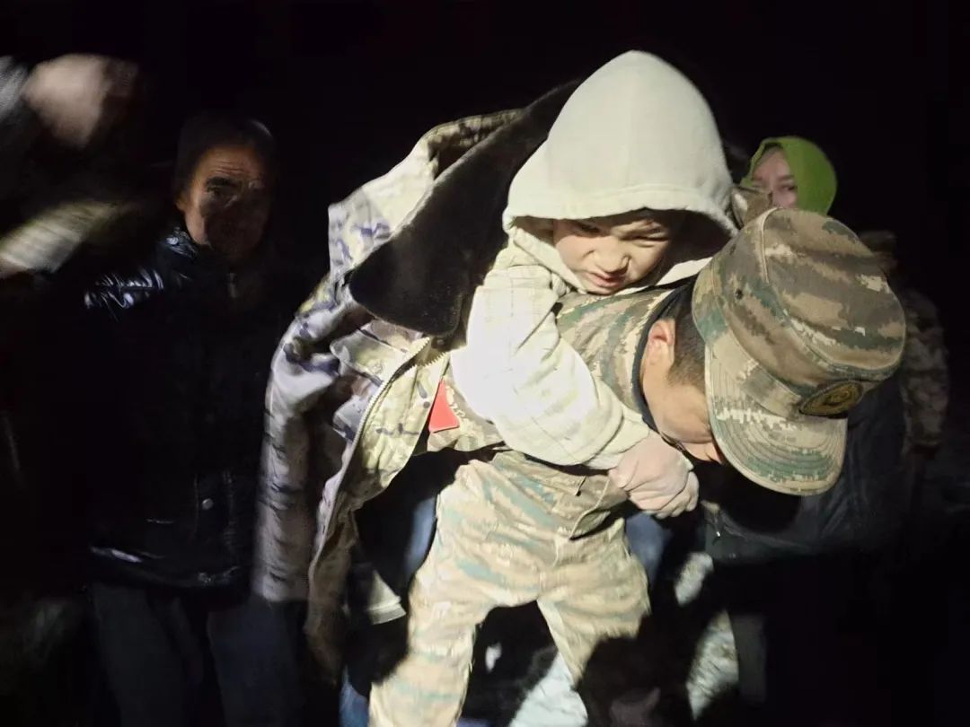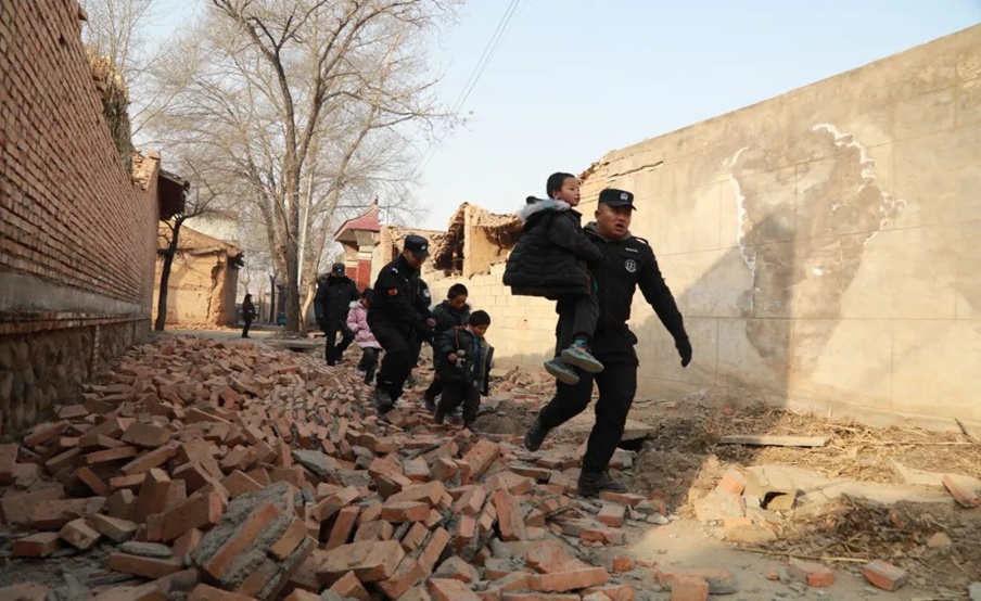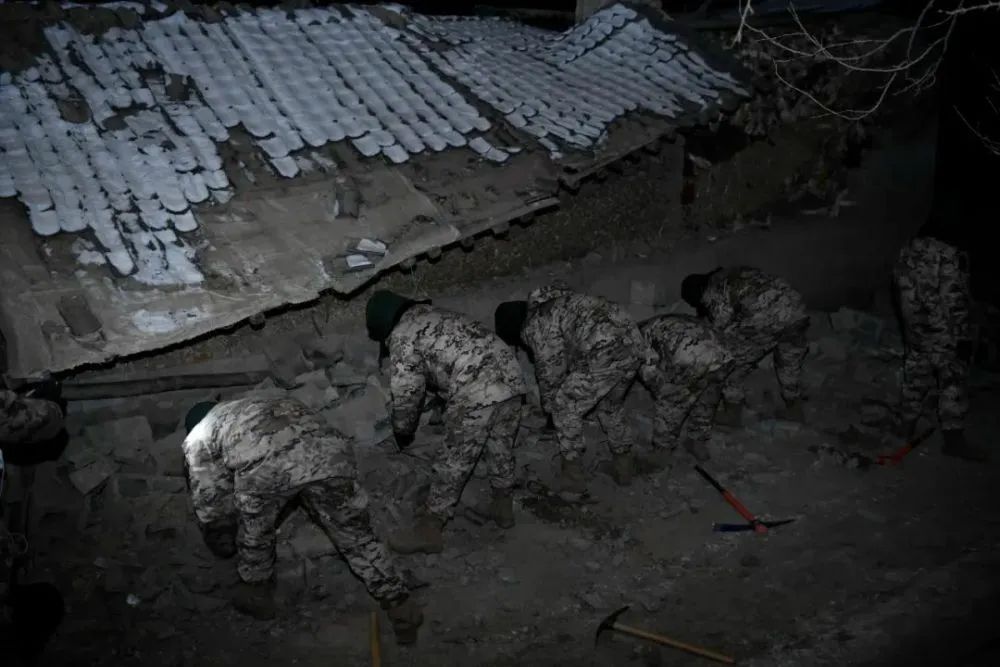 12月19日上午,临夏州公安局特警支队民警辅警在积石山县大河家镇陈家村开展救援。