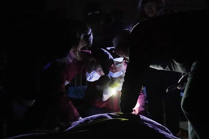 12月19日,在甘肃省临夏回族自治州积石山保安族东乡族撒拉族自治县中西医结合医院门口,医务工作者查看伤者情况。 新华社记者 马希平 摄