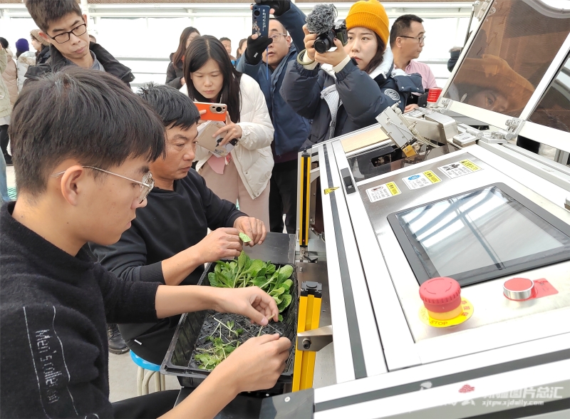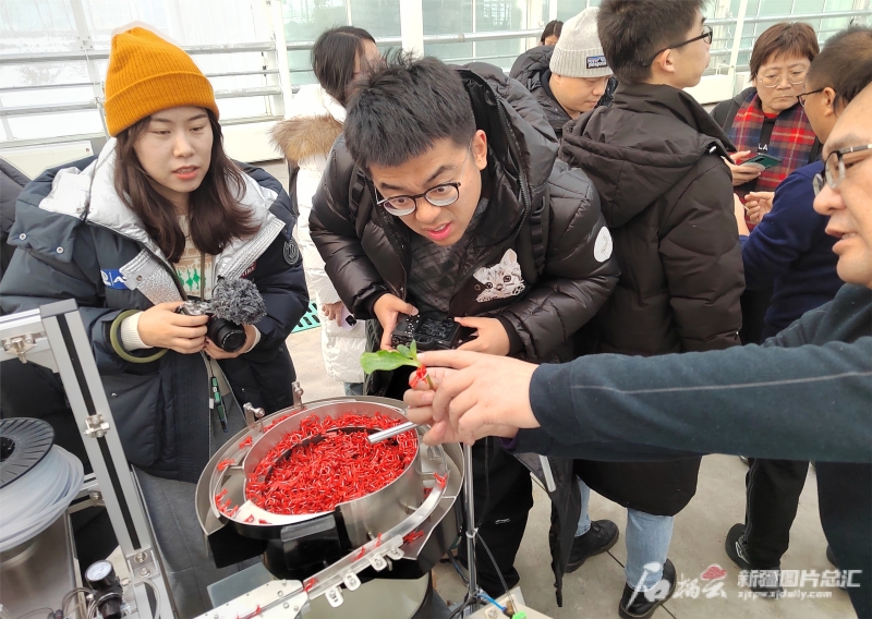 “四季看新疆”之“追着雪花看新疆”主题采访活动全媒体报道团队在未来农业科技馆内了解瓜菜自动嫁接机运转原理。石榴云/新疆日报记者 邹懿摄
