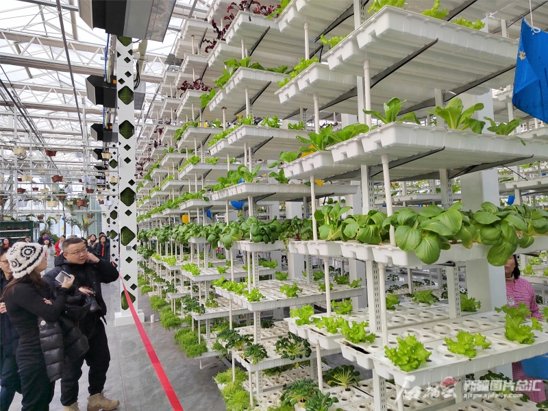 “四季看新疆”之“追着雪花看新疆”主题采访活动全媒体报道团队在垂直农业展示中心参观、采访。石榴云/新疆日报记者 邹懿摄