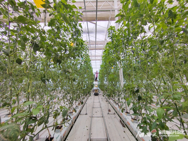 12月19日,工作人员在位于昌吉国家农业高新技术产业示范区新疆农业博览园的未来农业科技馆果菜种植工厂管护彩椒。石榴云/新疆日报记者 邹懿摄
