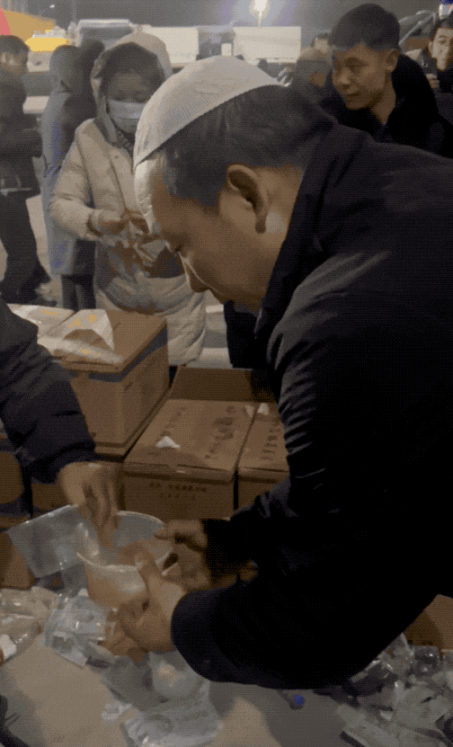 甘肃康乐县距离大河家镇陈家村100多公里,该县一家餐厅的老板得知陈家村灾情较重后关了店门,带上所有的员工,将店内的米、肉、油都运到了陈家村,在安置点做起了羊肉手抓饭,“这里的手抓饭只送,不收钱。”