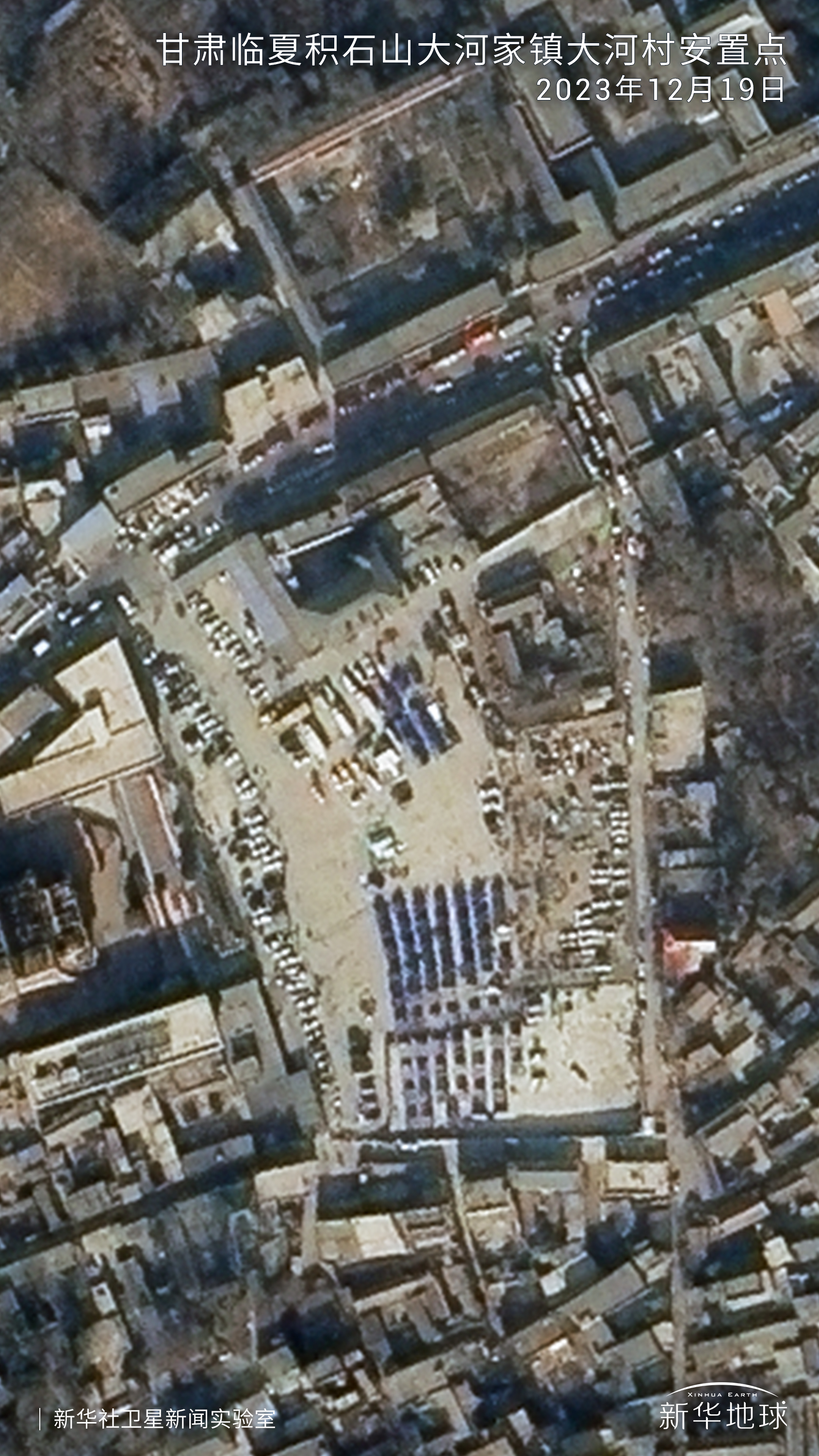 甘肃省临夏州积石山县大河家镇大河村安置点,应急帐篷整齐排列。2023年12月18日,甘肃积石山发生6.2级地震,截至12月22日,地震已致148人死亡,979人受伤,3人失联。各方力量全力以赴排查搜救、救治伤员,妥善安置受灾群众,抢修受灾基础设施,严防余震、低温等次生灾害。