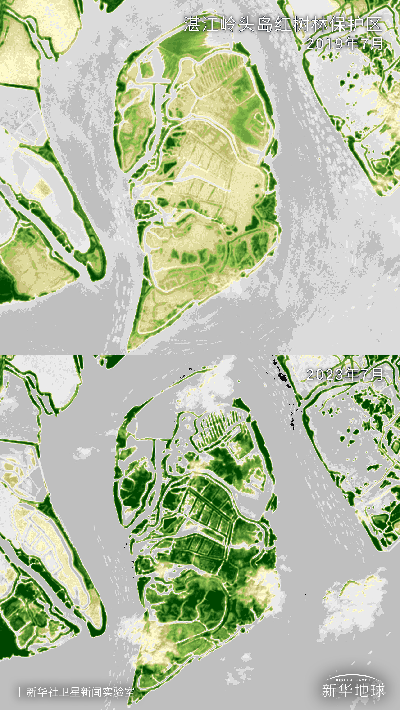 2023年7月,卫星观测显示,广东湛江岭头岛红树林保护区内植被叶绿素水平较高、一片茂盛。而4年前这里还是一片养殖塘的痕迹,植被稀少。近年来,全球红树林面积整体递减,中国却是世界上少数几个红树林面积净增加的国家之一。当月,全国生态环境保护大会在北京召开,习近平在讲话中强调,我们把生态文明建设作为关系中华民族永续发展的根本大计,开展了一系列开创性工作,决心之大、力度之大、成效之大前所未有,生态文明建设从理论到实践都发生了历史性、转折性、全局性变化。