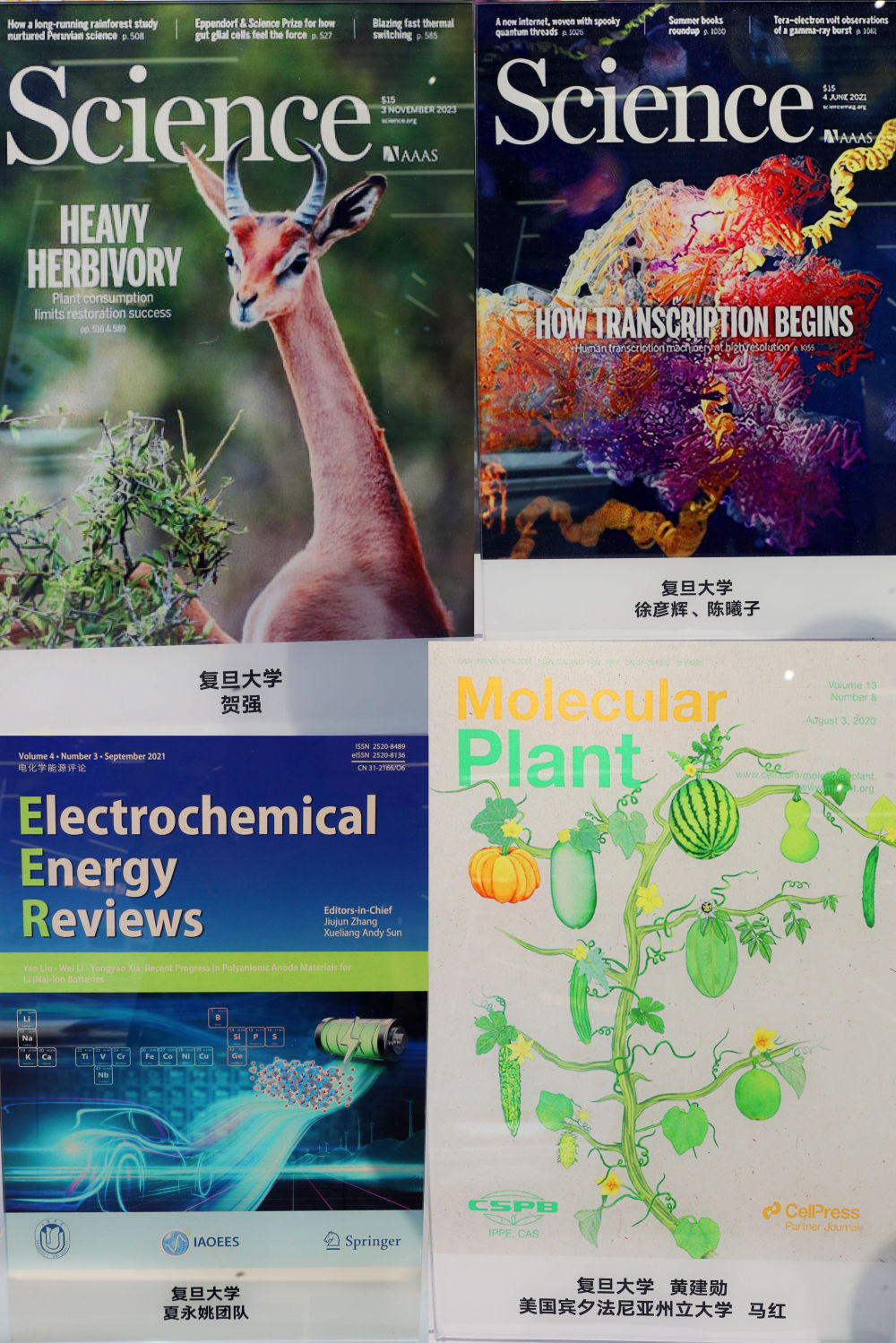 拼版照片是2023年11月29日在上海科技创新成果展上拍摄的以复旦大学科研成果为封面的刊物。新华社记者 方喆 摄