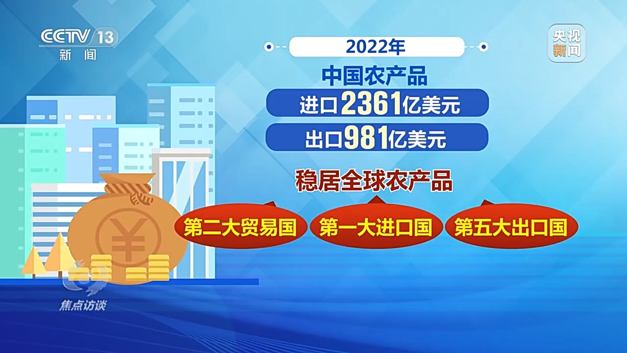 数据显示,2001年至2022年,中国农产品贸易额年均增长12.6%,农产品出口额年均增长9.1%,进口额年均增长15.4%。2022年,中国农产品进口2361亿美元,出口981亿美元,稳居全球农产品第二大贸易国、第一大进口国、第五大出口国。粮食安全的稳定性,离不开农业供应链的安全可控。