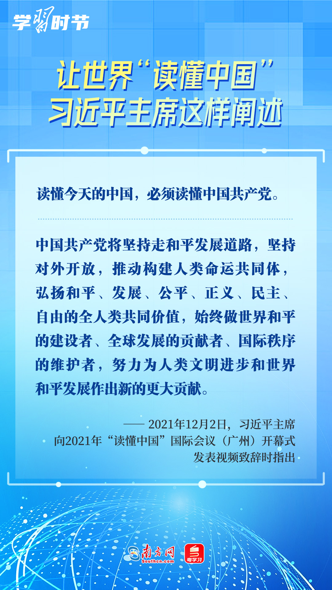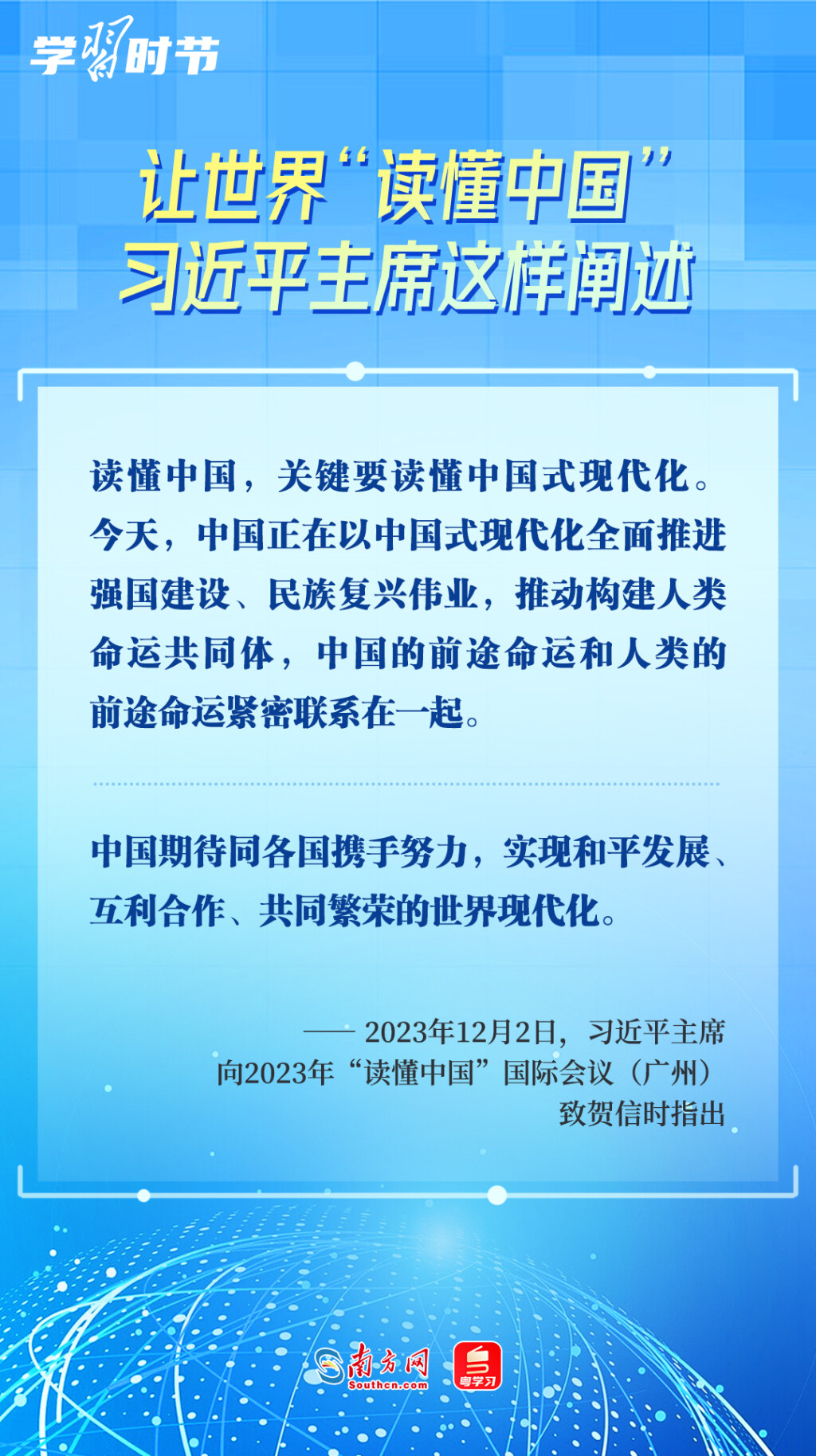 12月2日,2023年“读懂中国”国际会议在广州开幕,国家主席习近平向会议致贺信。习近平主席在贺信中指出,“读懂中国,关键要读懂中国式现代化。”
