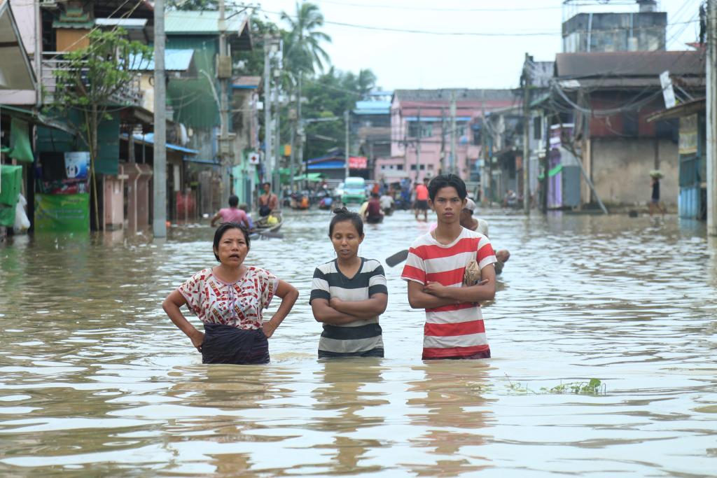 2023年8月12日,人们在缅甸勃固镇被水淹没的道路上涉水前行。新华社发(苗觉梭摄)