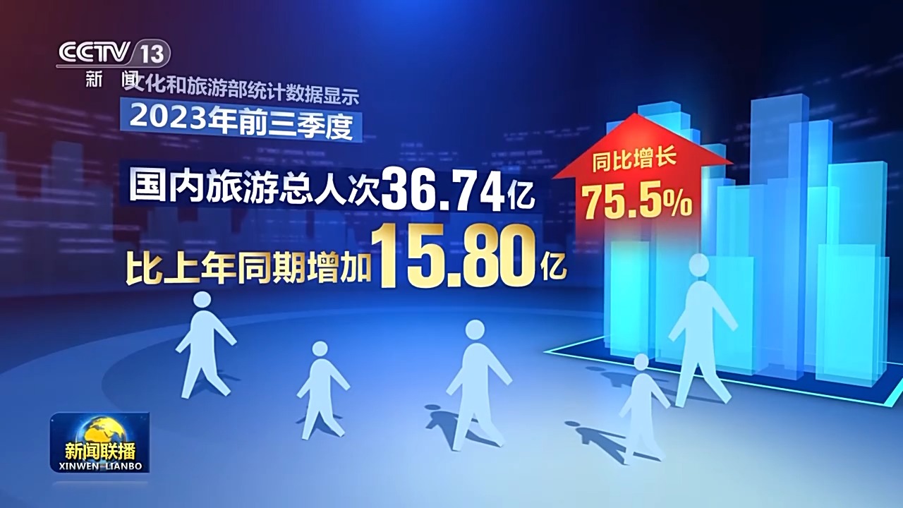 文化和旅游部统计数据显示,2023年前三季度,国内旅游总人次36.74亿,比上年同期增加15.80亿,同比增长75.5%。2023年前三季度,居民国内出游总花费3.69万亿元,比上年增加1.97万亿元,增长114.4%。预计在今年12月至明年春节期间,冰雪游、出入境旅游等消费将迎来新高。