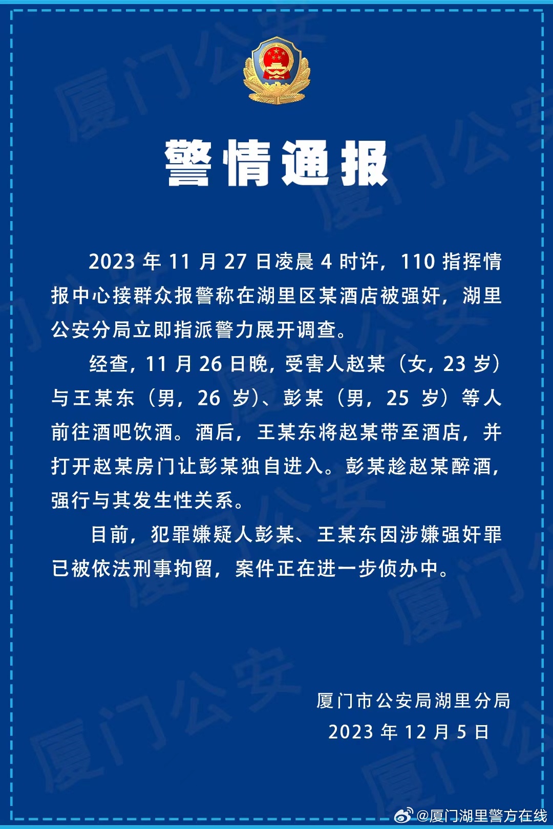 厦门警方通报两名教师涉强奸案:涉事人员被刑拘