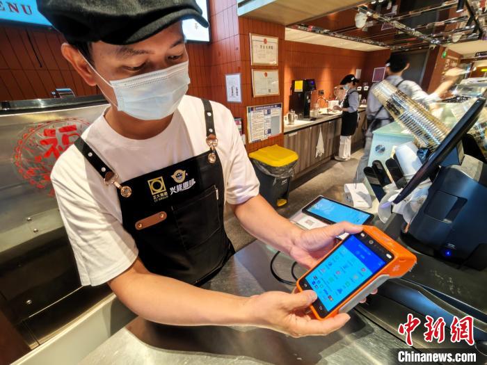 6月13日,太阳河兴隆咖啡海口骑楼店店长符传贵展示可受理外卡刷卡的智能POS机。中新社记者 王子谦 摄