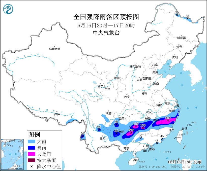 预计,6月16日20时至17日20时,浙江中南部、福建中北部和东南部沿海、江西中北部、湖南中南部、贵州、四川南部、云南东北部和西部、广西中北部、广东北部和东南部沿海等地部分地区有大到暴雨,其中,湖南中部、江西中部、浙江南部、福建北部、贵州东南部、广西东北部等地部分地区有大暴雨,局地特大暴雨(250~270毫米)。上述部分地区伴有短时强降水(最大小时降雨量30~50毫米,局地可超过70毫米),局地有雷暴大风等强对流天气。